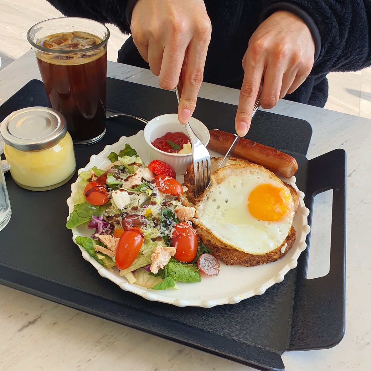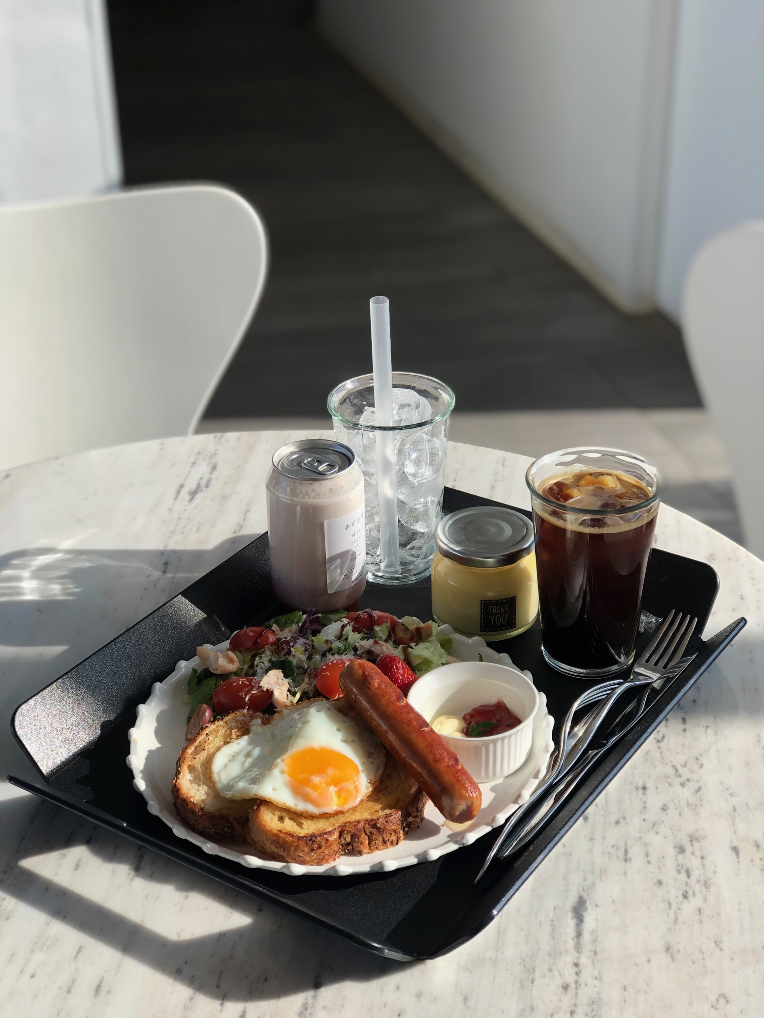 브런치세트와 카스타드 푸딩, 아이스 아메리카노, 딸기우유를 주문했다.